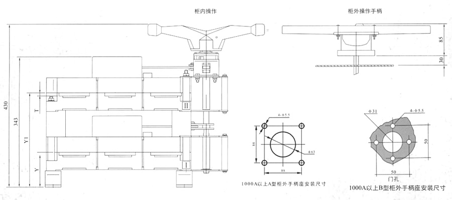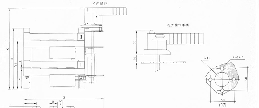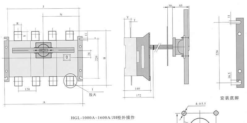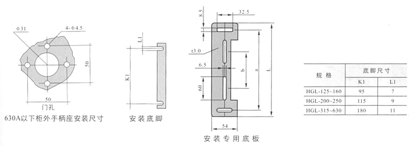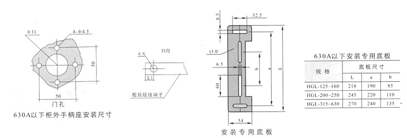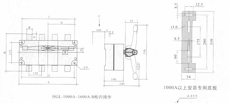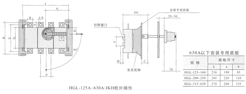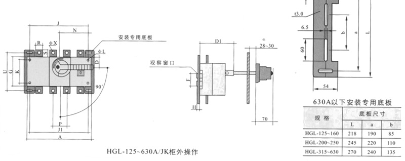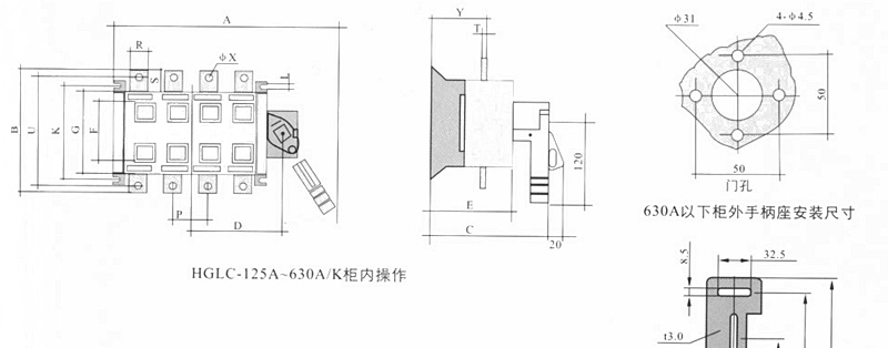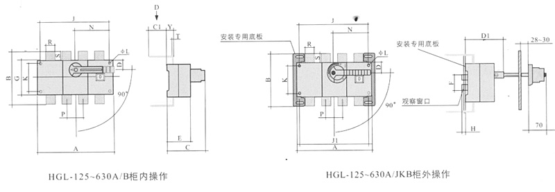 侧面操作负荷隔离开关 HGLC-125~1600A适用于电路的接通与分断或电气隔离。有三极、四极(三极+可通断中性极) 可根据需要提供有观察窗口的产品,直接观察触头的通断状态。 柜内操作:手柄安装在开关右侧。 柜外操作:手柄安装在配电柜柜门外。 根据需要可配装两组辅助触点。 加长轴用于柜外操作。 电气性能与机械性能和HGL-125~1600A电气性能与机械性能相对应。 ![]() HGL-125A~630A负荷隔离开关