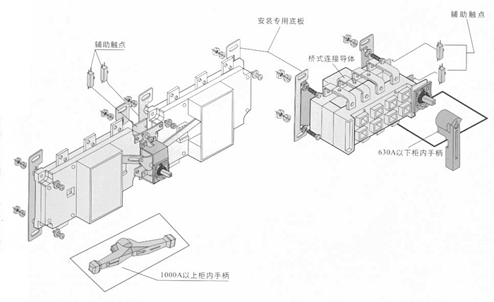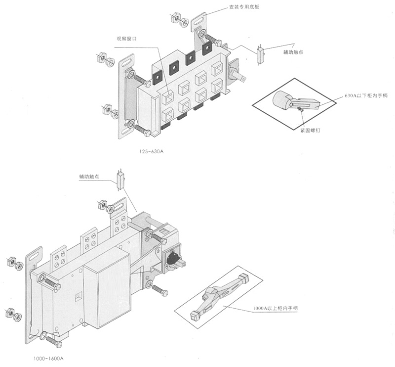 HGL-125A~1600A负荷隔离开关 转换负荷隔离开关 HGLZ-125~1600A适用于两条低压电路切换或者两个负载设备的转换或安全隔离等。 柜内操作:手柄直接安装在开关上。 柜外操作:手柄安装在配电柜柜门外。 可根据需要提供有观察窗口的产品,直接观察触头通断状态。 有三极、四极(三极+可通断中性极)。 加长轴用于柜外操作 根据需要可配装两组辅助触点。 电气性能与机械性能和HGL-125~1600A电气性能与机械性能相对应。 可提供桥式连接导体接通开关的进线端或出线端。 注:1000A以上开关分为上下和左右排列两种形式,订货时说明。